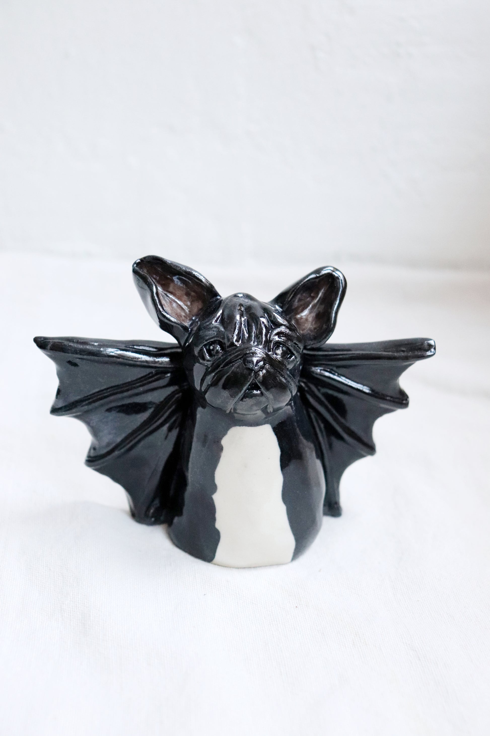 Mycket läskig french bulldog, aka fralla, som klätt ut sig till fladdermus!