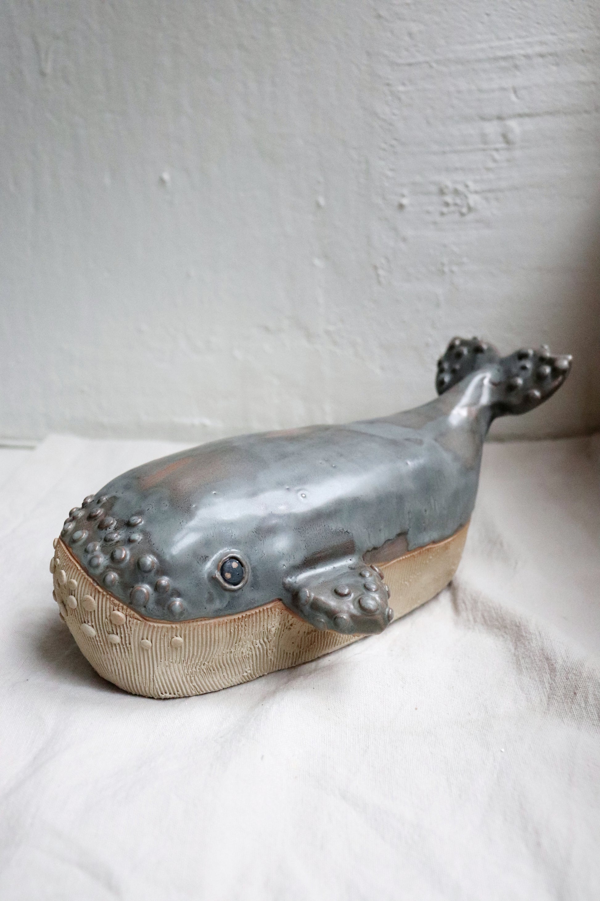 Skulpterad knölval i stengodslera. 25 cm lång från stjärt till nos