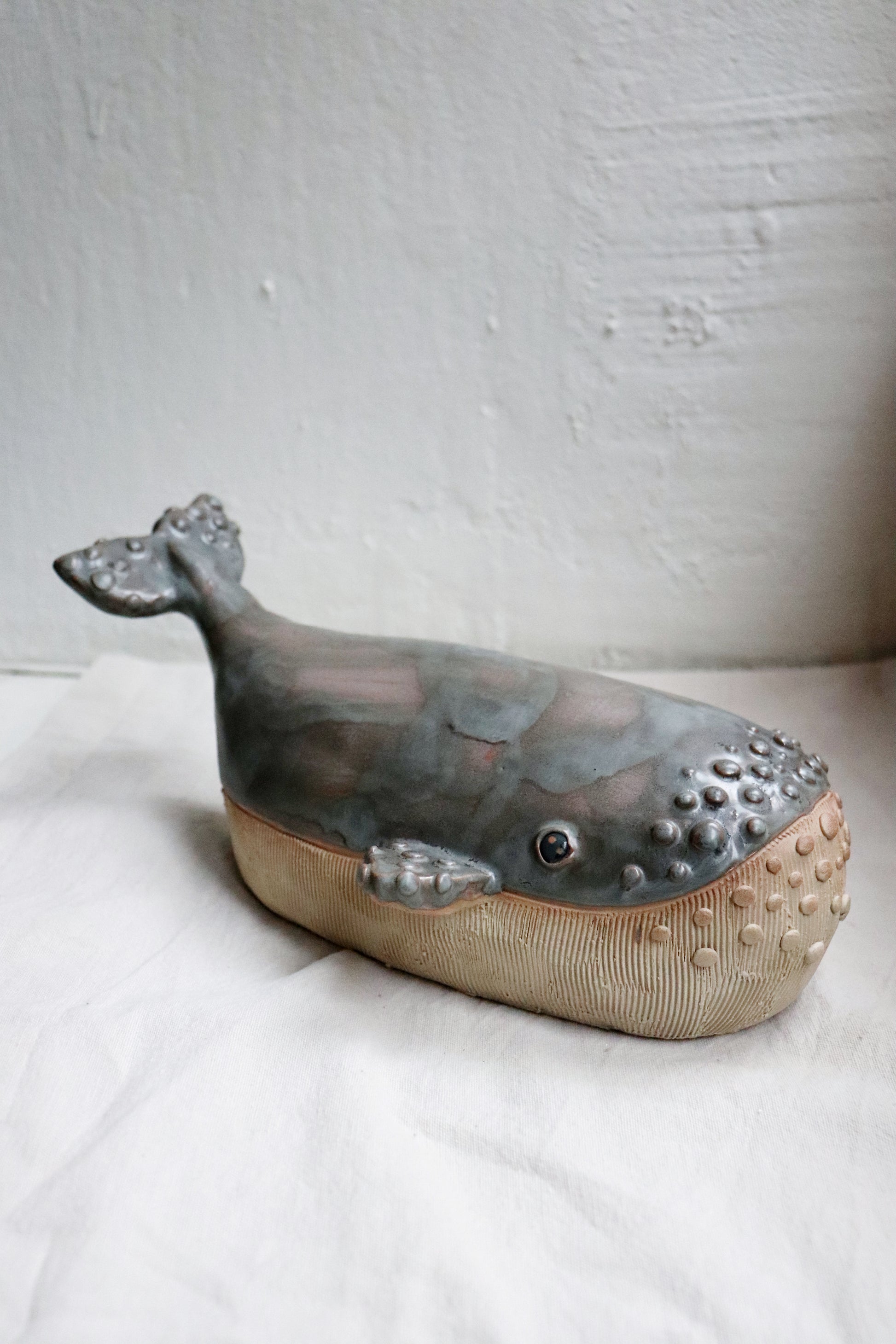 Skulpterad knölval i stengodslera. 26 cm lång