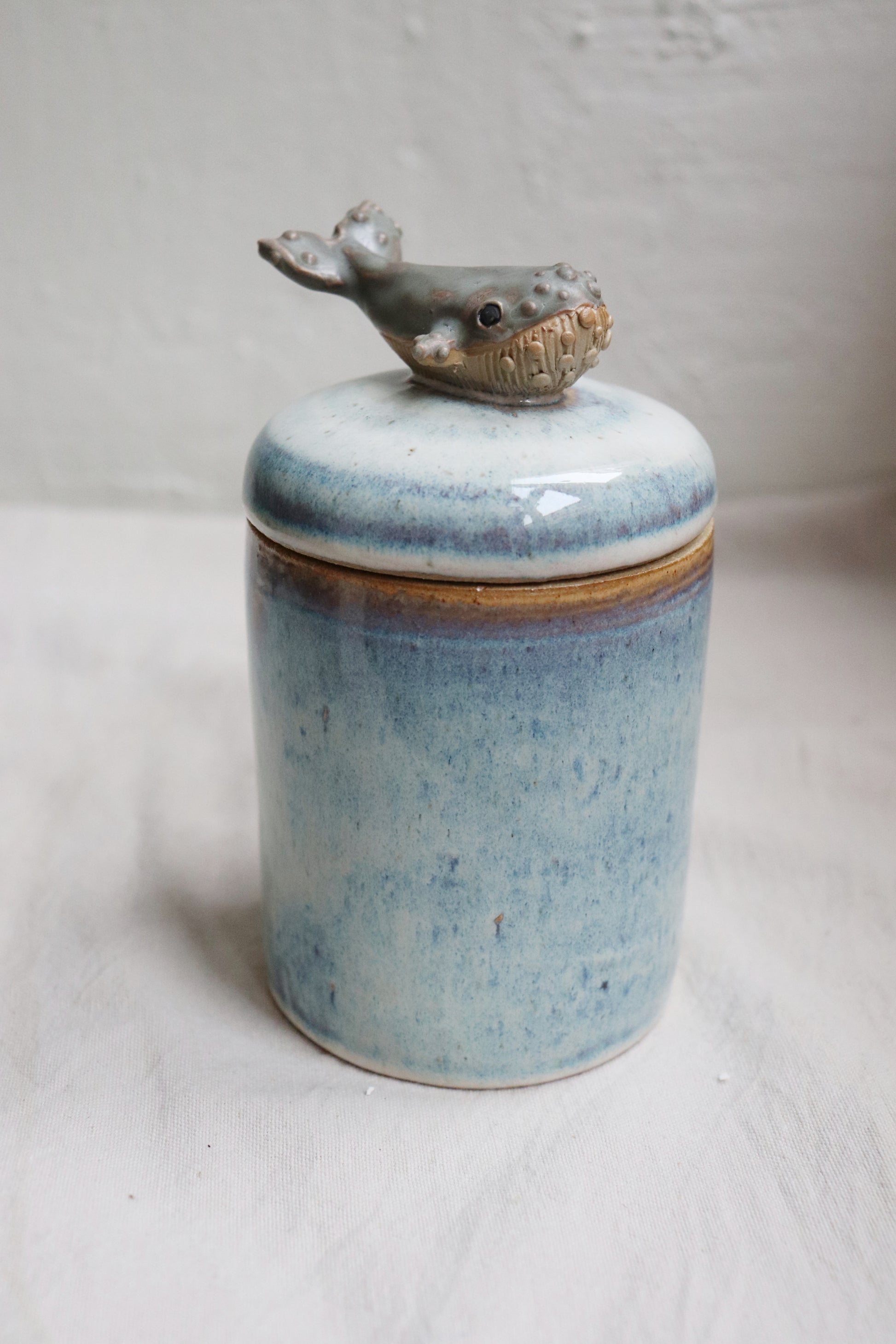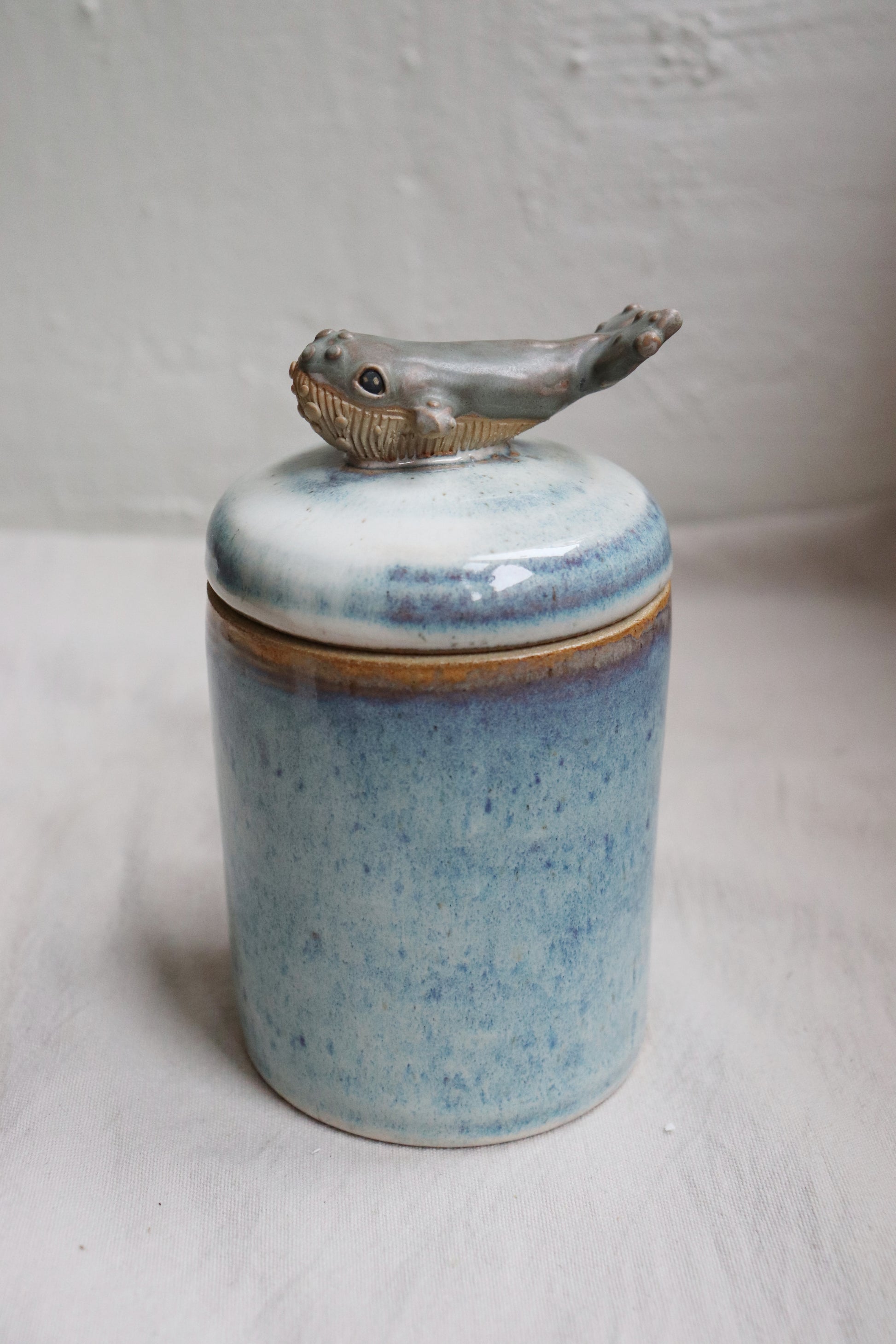 Drejad burk i stengodslera med skulpterad knölval som knopp. Ca 11 cm hög.