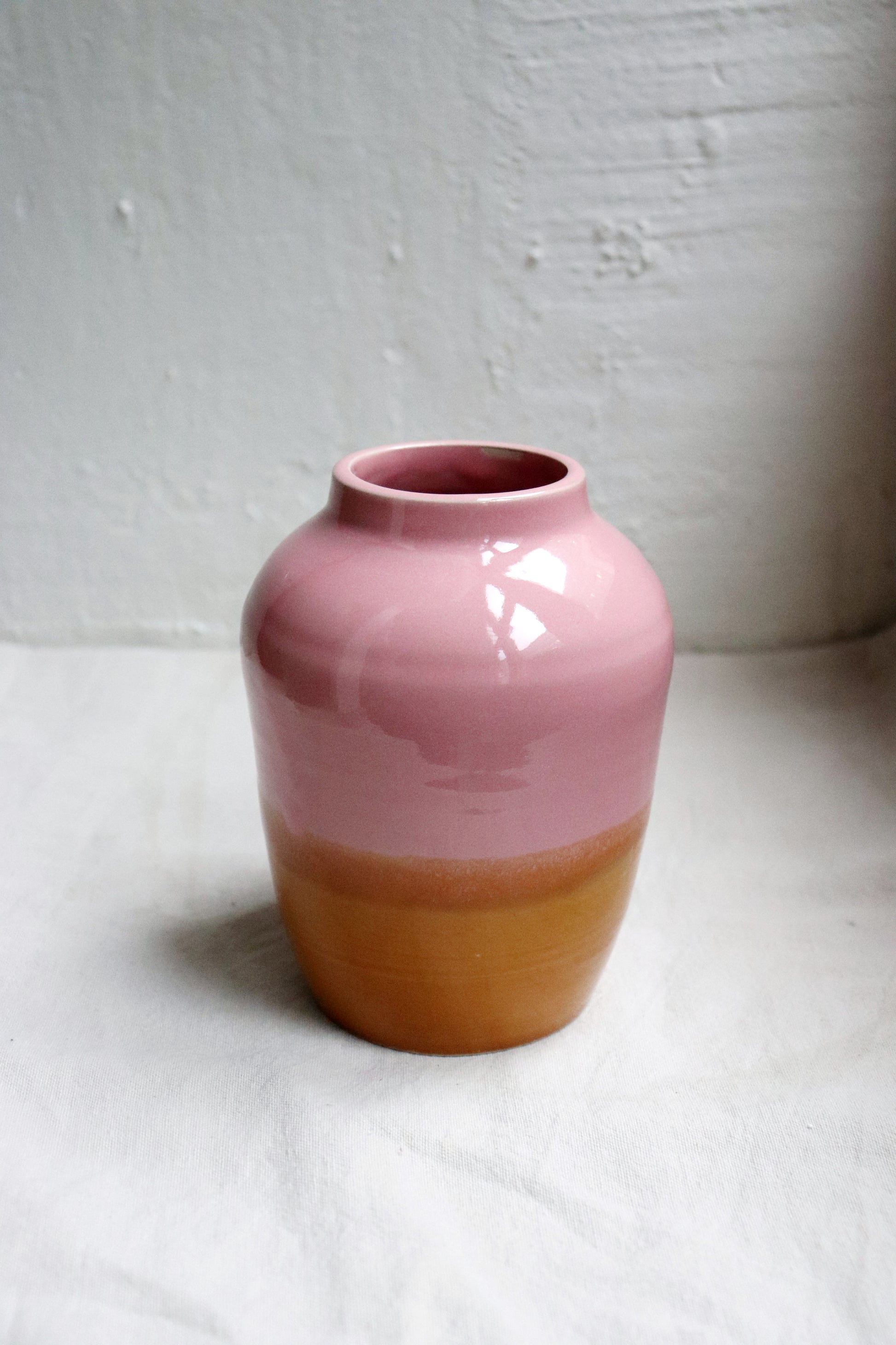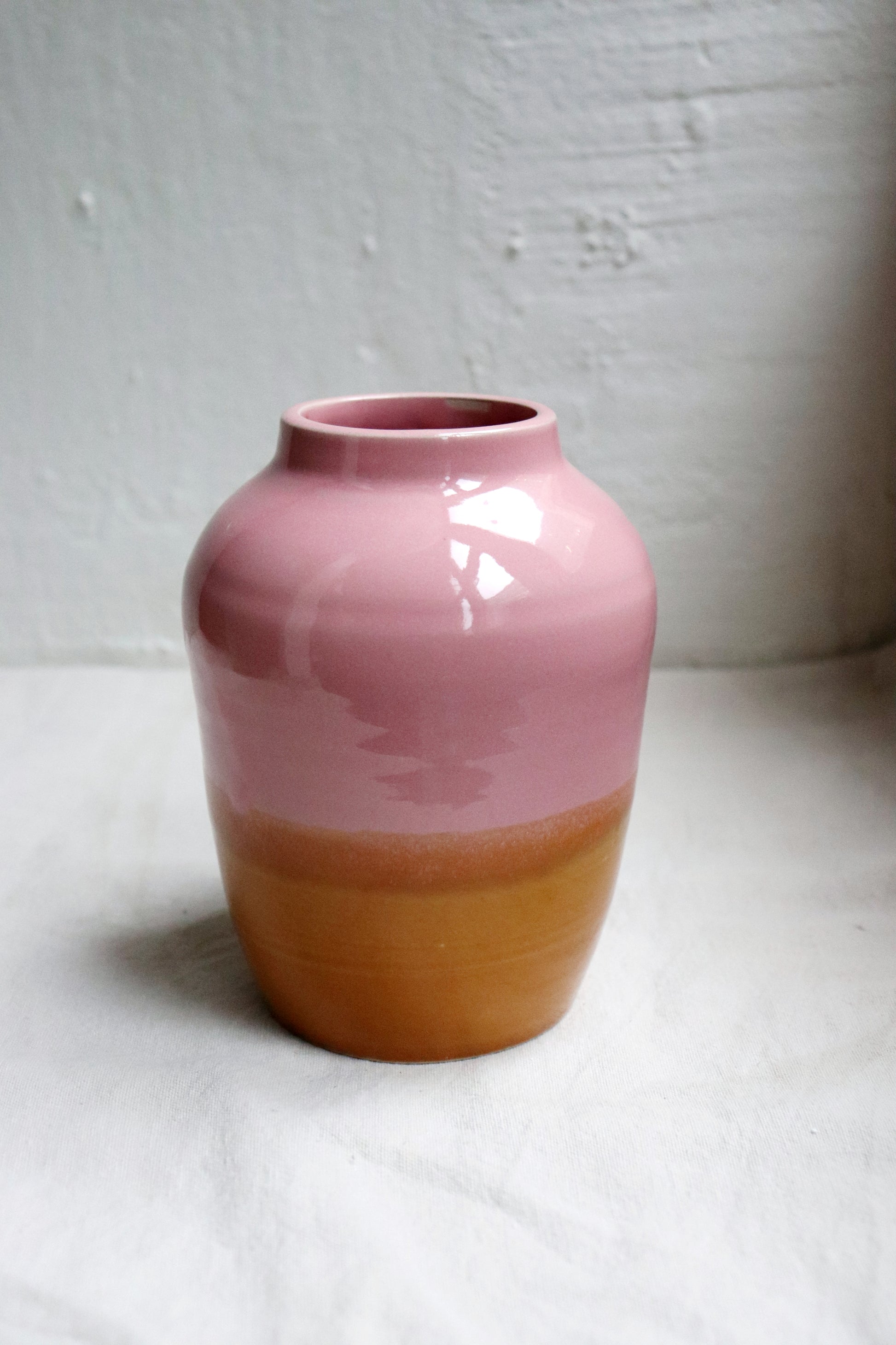 Drejad vas i stengodslera, glaserad i rosa upptill och turkost nedtill. Ca 15 cm hög