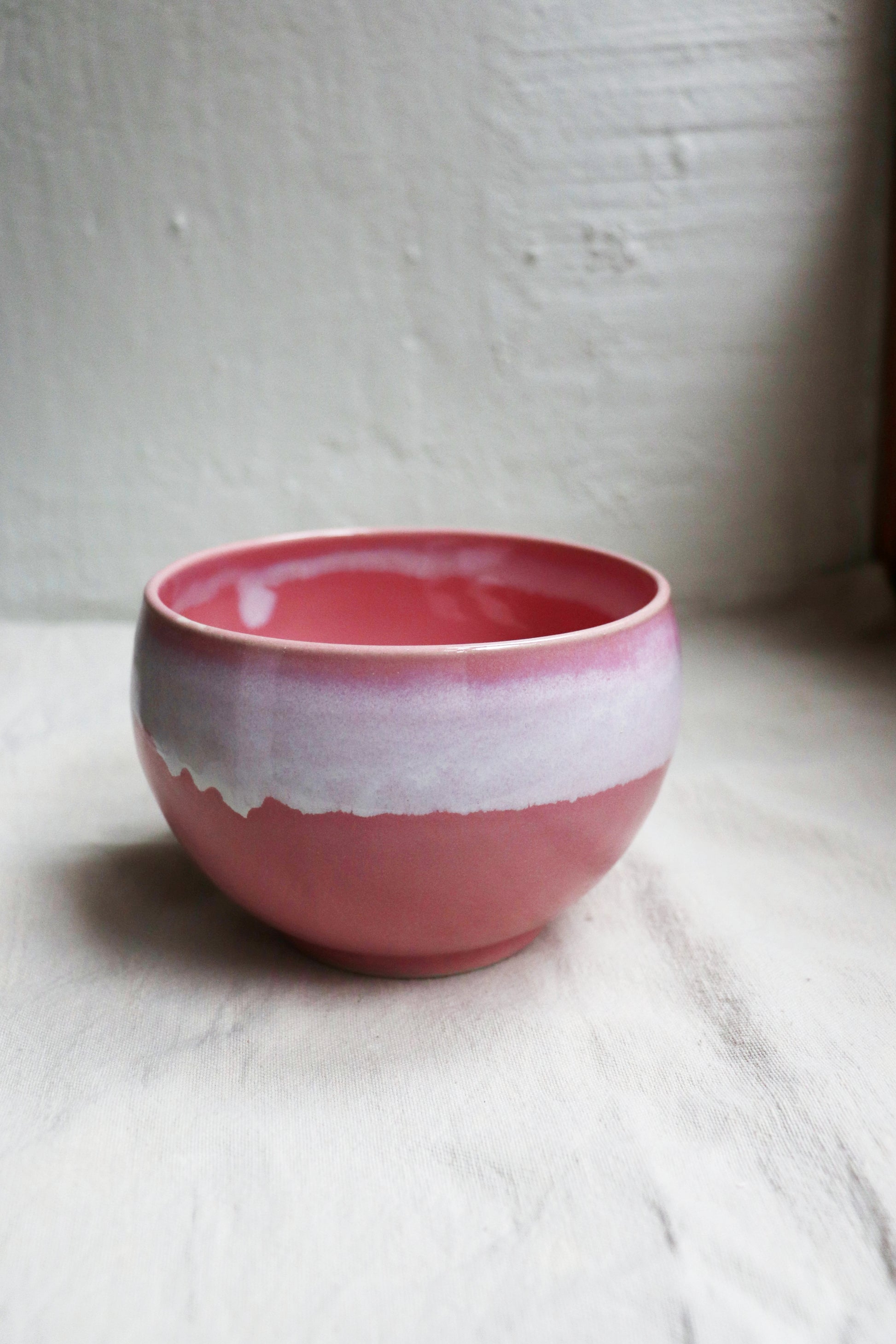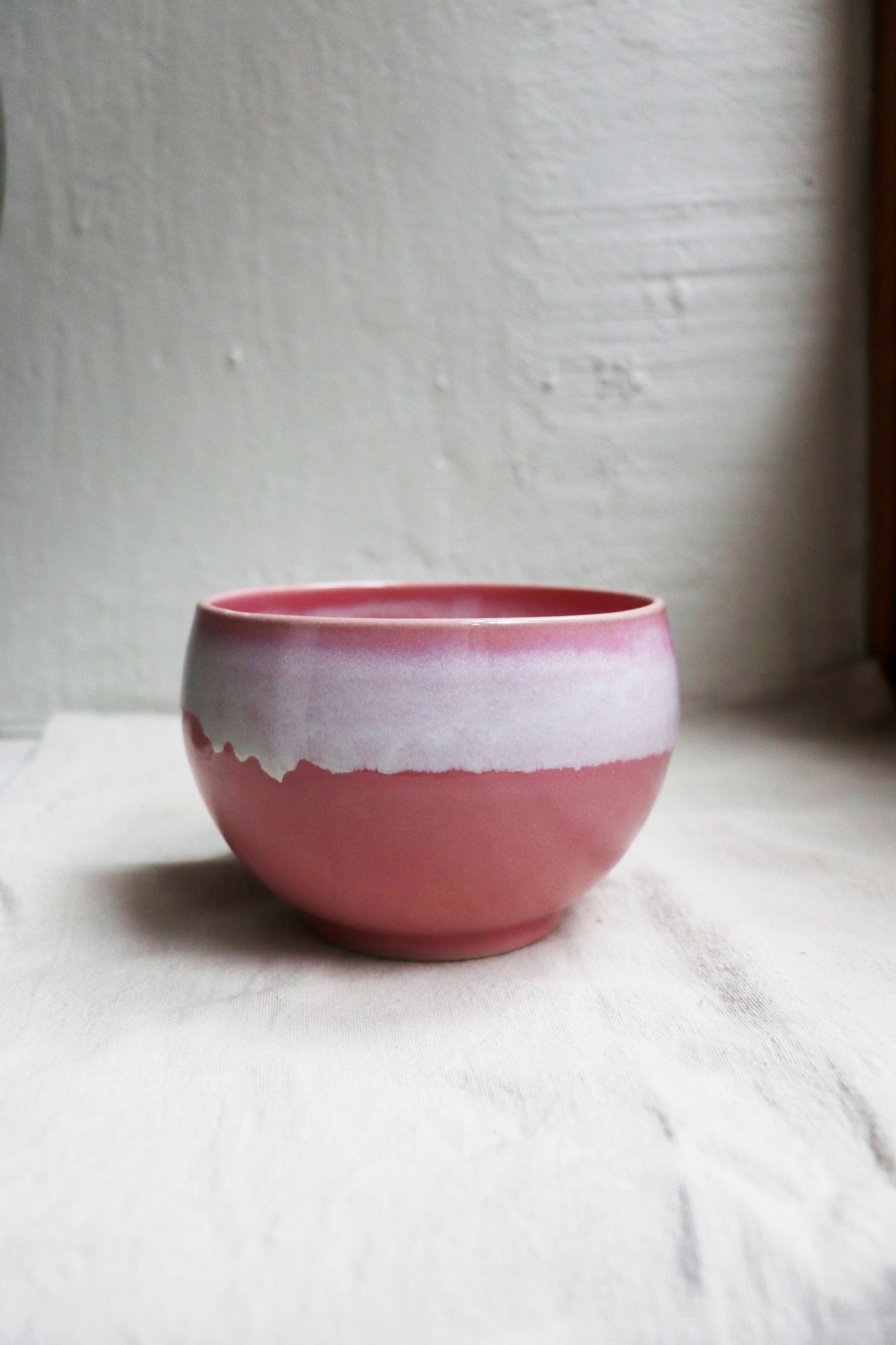 Drejad skål i stengodslera, glaserad i rosa och vitt. Ca 9 cm i höjd och 12 cm i diameter.