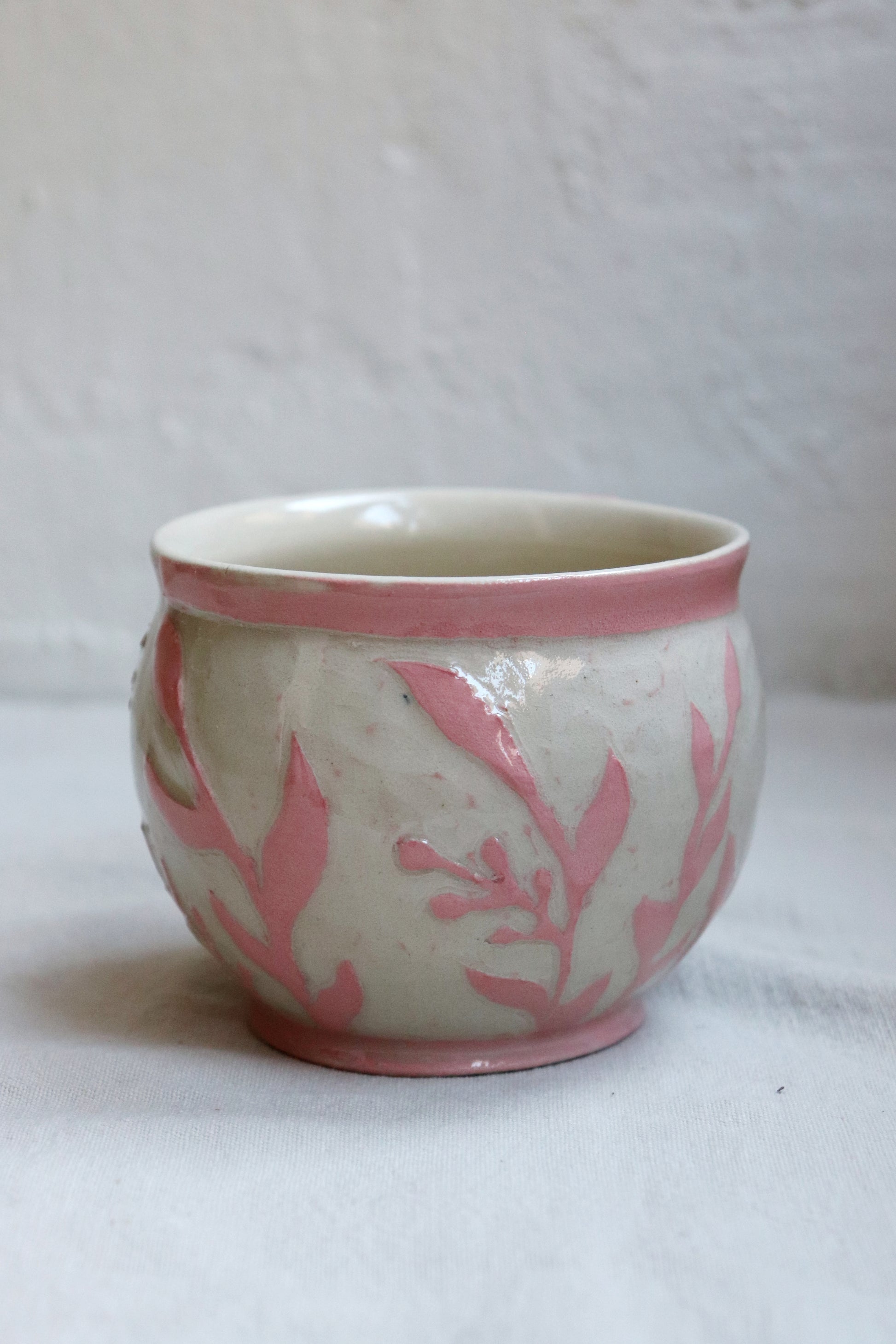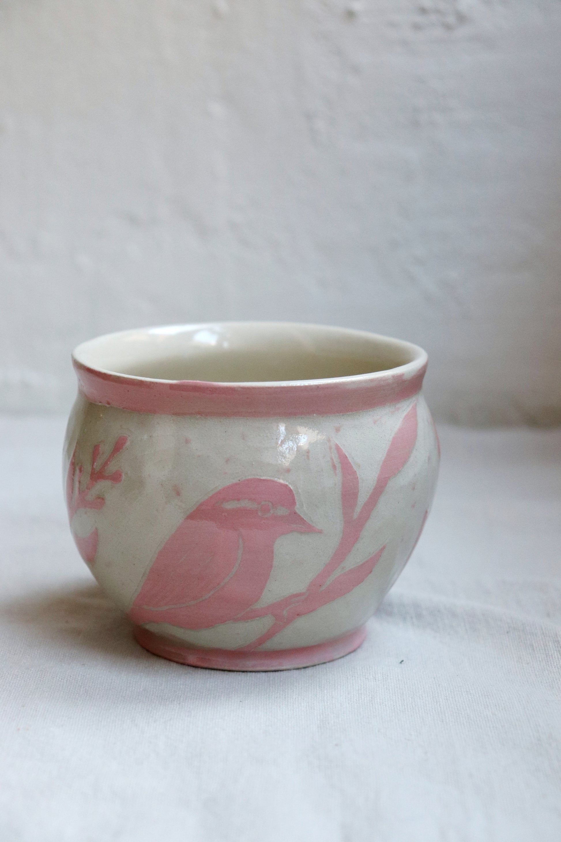 Drejad skål med nötväcka som motiv. Jag har gjort en kollektion med tema fåglar och växter jag såg i Japan och det här motivet är del av det. Koppen är dekorerad med sgraffito-teknik där jag först målat hela koppen med rosa engobe och sen karvat bort där jag vill ha lerans ljusa färg.