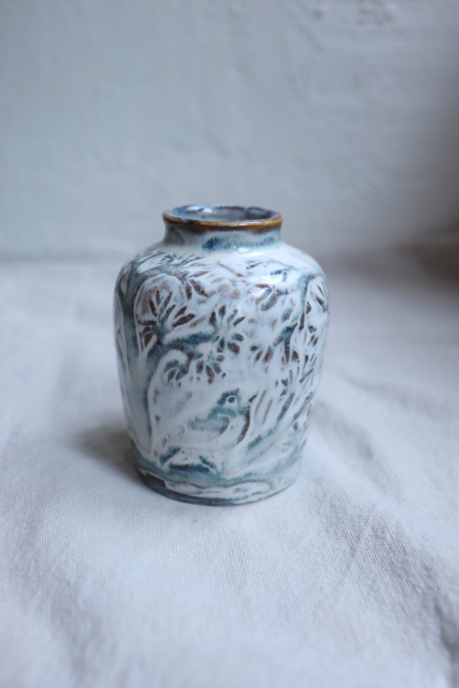 Drejad vas med sgraffitodekor, ca x cm hög. Hela vasen är först målad med mörk engobe, sen har jag karvat bort engoben där jag vill ha det ljusare och därefter lagt en rinnig ljus glasyr över. Det ger vasen en tredimensionell känsla i dekoren.